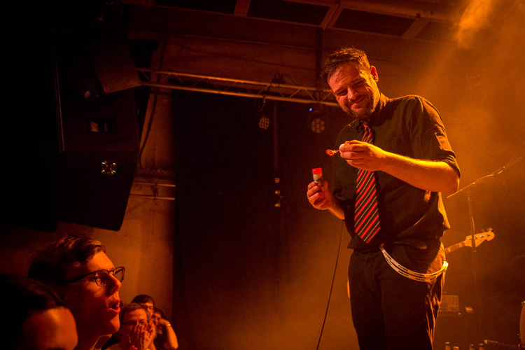 In den ersten Songs bekommt Gitarrist Stefan mehrfach Probleme mit der Technik zu seinen Füßen und steckt immer wieder das komplette Brett mit den Effektgeräten um. Währenddessen füllt Sänger Jörkk Mechenbier die Zwangspause mit Seifenblasen, kleinen Anekdoten und Beleidigungen für seinen Gitarristen – so wie es sich in einer guten Freundschaft gehört.