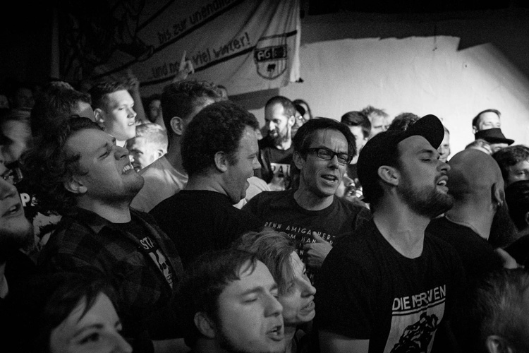 Köln macht die Unterbrechung wenig aus. Sie hängen sowieso an Jörkks Lippen und so fühlt es sich nach Wiederaufnahme der Musik an, als sei nie was gewesen. Touché an Band und Publikum dafür. Die folgende Setlist folgt dem Motto der Gleichberechtigung. Alle vier Alben bekommen ähnliche Bühnenzeiten, trotzdem sind anhand der Lautstärke gemessen die Highlights der Kölner vor allem Trümmer, 100.000 Stühle leer, Nachbarn und das auf Zuruf eingebundene Freibad.